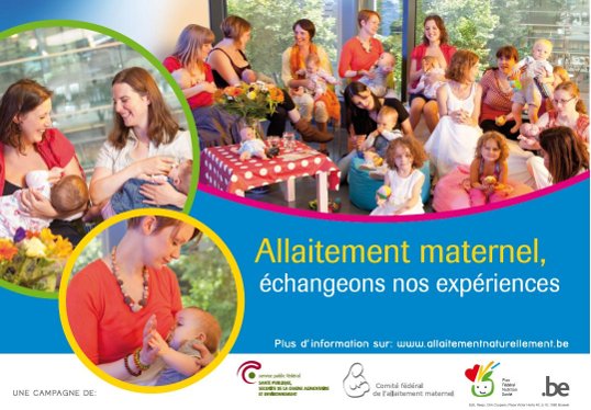 L'affiche, réalisée à l'occasion de la Semaine Mondiale de l'Allaitement Maternel (du 1er au 7 octobre 2013) par le Plan National Nutrition Santé et le Comité fédéral de l'allaitement maternel, illustre remarquablement l'importance du partage du vécu par les mères allaitantes. Le slogan que l'on retrouve sur l'affiche est très clair : "Allaitement maternel : échangeons nos expériences". Les mères allaitantes apprennent mutuellement de leurs expériences, s'entraident, renforcent leurs convictions et augmentent leur confiance en elle-même lorsqu'elles se rencontrent.
