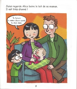Dans ce livre documentaire pour enfants de 6 à 9 ans, on voit une maman allaiter avec comme commentaire "quelques heures [après sa naissance], il (le bébé) veut téter ou boire au biberon".